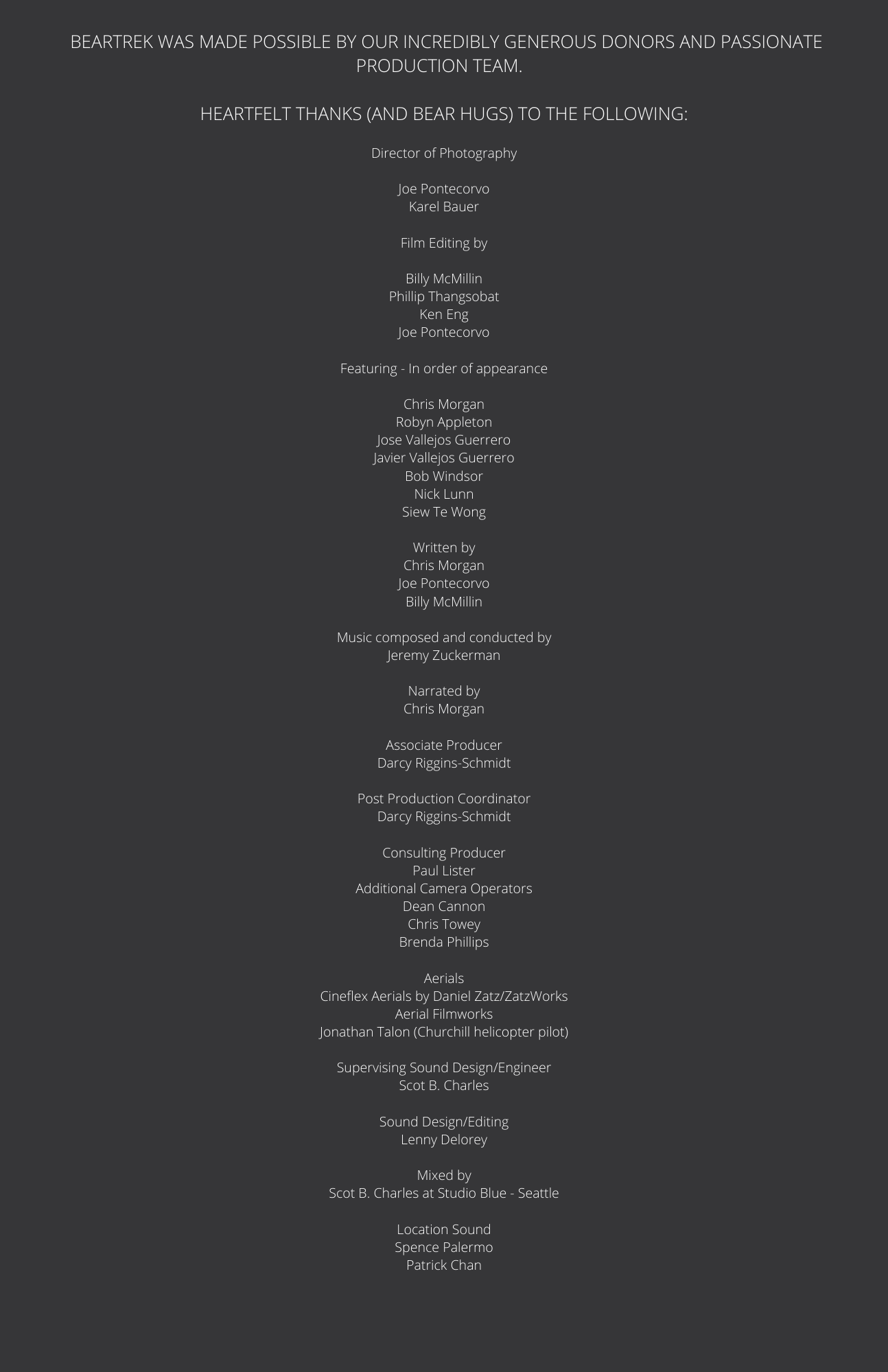 BEARTREK WAS CREATED BY A PASSIONATE TEAM OF FILMMAKERS, ECOLOGISTS, AND SCIENTISTS WHO HAVE DEDICATED THEIR LIVES TO PROMOTING THE WELL-BEING OF OUR PLANET.